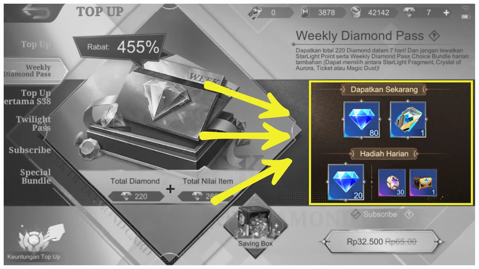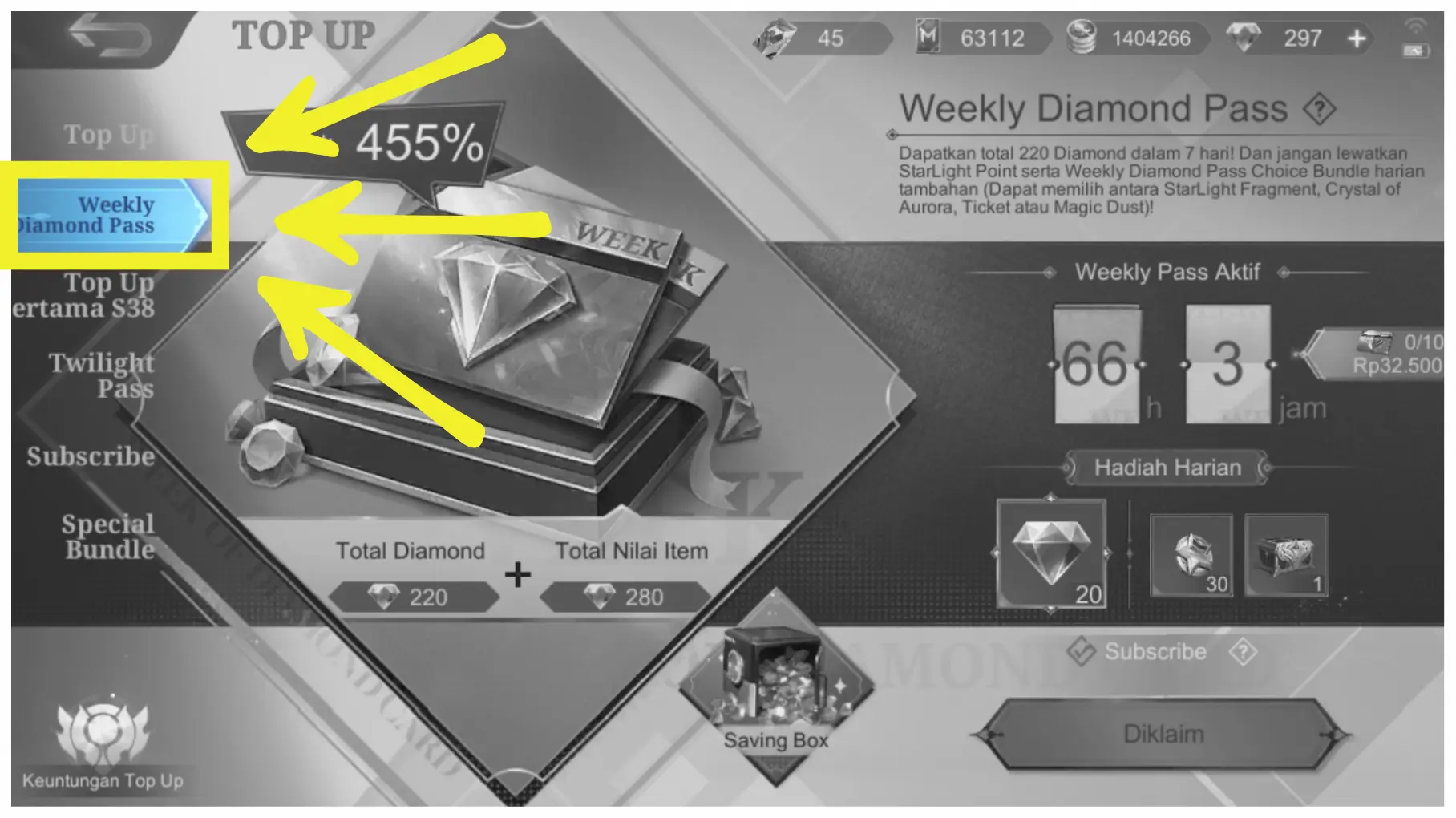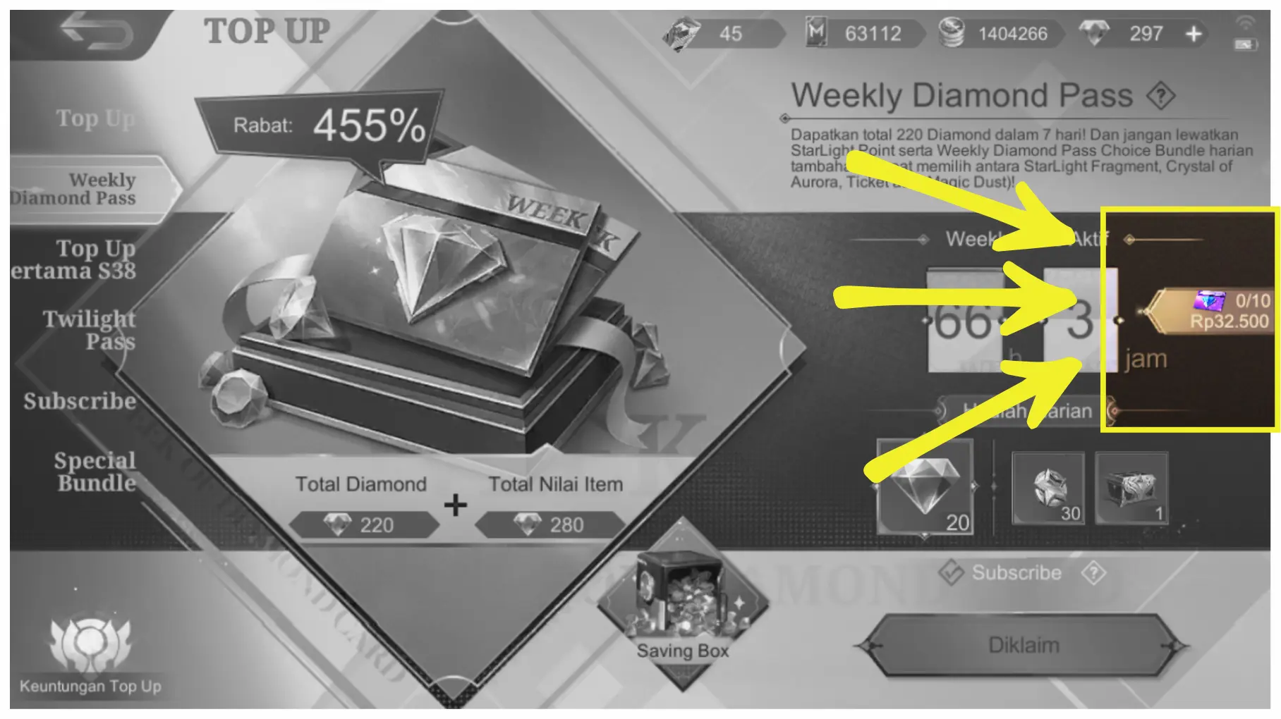 3. Di bagian kotak berwarna kuning di kanan, kalian bisa lihat limit Weekly Diamond Pass.
